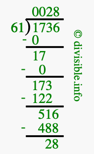 The image displays 28 at the top, which is the quotient, and 28 at the bottom, which is the remainder. Therefore, the answer to 1736 divided by 61 (1736 ÷ 61) using long division is 28 remainder 28, or simply 28 R 28.
