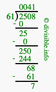 The image displays 41 at the top, which is the quotient, and 7 at the bottom, which is the remainder. Therefore, the answer to 2508 divided by 61 (2508 ÷ 61) using long division is 41 remainder 7, or simply 41 R 7.