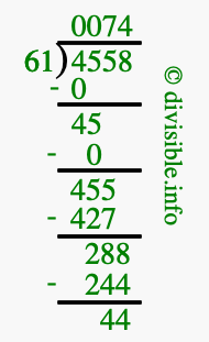 The image displays 74 at the top, which is the quotient, and 44 at the bottom, which is the remainder. Therefore, the answer to 4558 divided by 61 (4558 ÷ 61) using long division is 74 remainder 44, or simply 74 R 44.