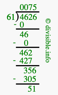 The image displays 75 at the top, which is the quotient, and 51 at the bottom, which is the remainder. Therefore, the answer to 4626 divided by 61 (4626 ÷ 61) using long division is 75 remainder 51, or simply 75 R 51.