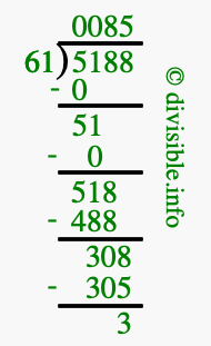 The image displays 85 at the top, which is the quotient, and 3 at the bottom, which is the remainder. Therefore, the answer to 5188 divided by 61 (5188 ÷ 61) using long division is 85 remainder 3, or simply 85 R 3.