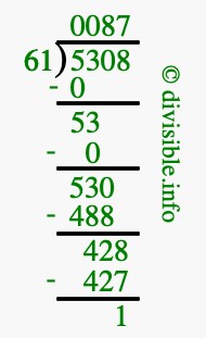 The image displays 87 at the top, which is the quotient, and 1 at the bottom, which is the remainder. Therefore, the answer to 5308 divided by 61 (5308 ÷ 61) using long division is 87 remainder 1, or simply 87 R 1.