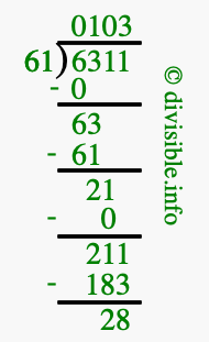 The image displays 103 at the top, which is the quotient, and 28 at the bottom, which is the remainder. Therefore, the answer to 6311 divided by 61 (6311 ÷ 61) using long division is 103 remainder 28, or simply 103 R 28.