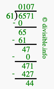 The image displays 107 at the top, which is the quotient, and 44 at the bottom, which is the remainder. Therefore, the answer to 6571 divided by 61 (6571 ÷ 61) using long division is 107 remainder 44, or simply 107 R 44.