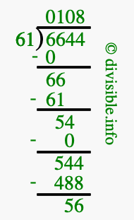 The image displays 108 at the top, which is the quotient, and 56 at the bottom, which is the remainder. Therefore, the answer to 6644 divided by 61 (6644 ÷ 61) using long division is 108 remainder 56, or simply 108 R 56.