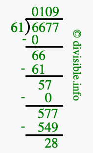 The image displays 109 at the top, which is the quotient, and 28 at the bottom, which is the remainder. Therefore, the answer to 6677 divided by 61 (6677 ÷ 61) using long division is 109 remainder 28, or simply 109 R 28.