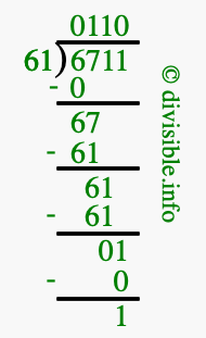 The image displays 110 at the top, which is the quotient, and 1 at the bottom, which is the remainder. Therefore, the answer to 6711 divided by 61 (6711 ÷ 61) using long division is 110 remainder 1, or simply 110 R 1.