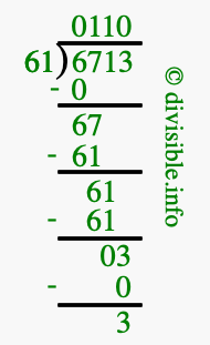 The image displays 110 at the top, which is the quotient, and 3 at the bottom, which is the remainder. Therefore, the answer to 6713 divided by 61 (6713 ÷ 61) using long division is 110 remainder 3, or simply 110 R 3.