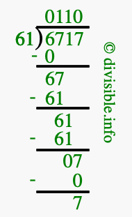 The image displays 110 at the top, which is the quotient, and 7 at the bottom, which is the remainder. Therefore, the answer to 6717 divided by 61 (6717 ÷ 61) using long division is 110 remainder 7, or simply 110 R 7.