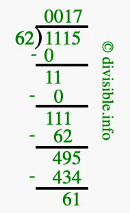 The image displays 17 at the top, which is the quotient, and 61 at the bottom, which is the remainder. Therefore, the answer to 1115 divided by 62 (1115 ÷ 62) using long division is 17 remainder 61, or simply 17 R 61.