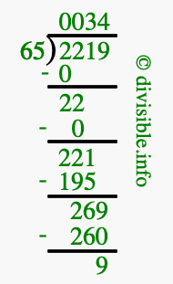 The image displays 34 at the top, which is the quotient, and 9 at the bottom, which is the remainder. Therefore, the answer to 2219 divided by 65 (2219 ÷ 65) using long division is 34 remainder 9, or simply 34 R 9.