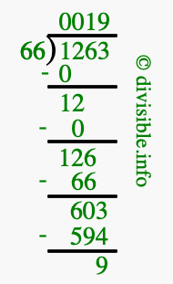 The image displays 19 at the top, which is the quotient, and 9 at the bottom, which is the remainder. Therefore, the answer to 1263 divided by 66 (1263 ÷ 66) using long division is 19 remainder 9, or simply 19 R 9.