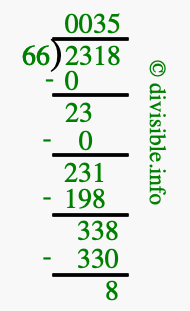 The image displays 35 at the top, which is the quotient, and 8 at the bottom, which is the remainder. Therefore, the answer to 2318 divided by 66 (2318 ÷ 66) using long division is 35 remainder 8, or simply 35 R 8.