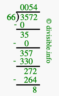 Here we will show you an image that illustrates how to calculate 3572 divided by 66 using long division. We will also give you the answer to 3572 divided by 66 (3572 ÷ 66) as a fraction and as a decimal.