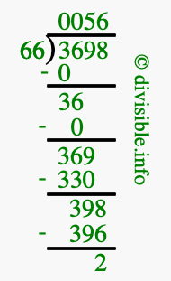 The image displays 56 at the top, which is the quotient, and 2 at the bottom, which is the remainder. Therefore, the answer to 3698 divided by 66 (3698 ÷ 66) using long division is 56 remainder 2, or simply 56 R 2.