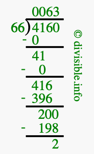 The image displays 63 at the top, which is the quotient, and 2 at the bottom, which is the remainder. Therefore, the answer to 4160 divided by 66 (4160 ÷ 66) using long division is 63 remainder 2, or simply 63 R 2.