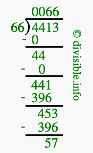 The image displays 66 at the top, which is the quotient, and 57 at the bottom, which is the remainder. Therefore, the answer to 4413 divided by 66 (4413 ÷ 66) using long division is 66 remainder 57, or simply 66 R 57.