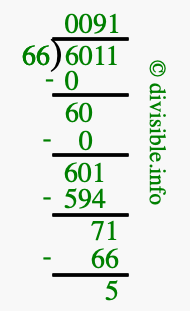 The image displays 91 at the top, which is the quotient, and 5 at the bottom, which is the remainder. Therefore, the answer to 6011 divided by 66 (6011 ÷ 66) using long division is 91 remainder 5, or simply 91 R 5.