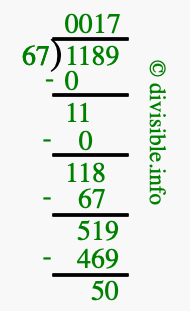 The image displays 17 at the top, which is the quotient, and 50 at the bottom, which is the remainder. Therefore, the answer to 1189 divided by 67 (1189 ÷ 67) using long division is 17 remainder 50, or simply 17 R 50.