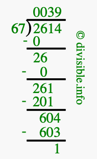 The image displays 39 at the top, which is the quotient, and 1 at the bottom, which is the remainder. Therefore, the answer to 2614 divided by 67 (2614 ÷ 67) using long division is 39 remainder 1, or simply 39 R 1.