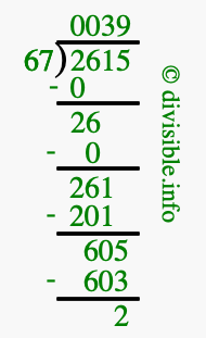 The image displays 39 at the top, which is the quotient, and 2 at the bottom, which is the remainder. Therefore, the answer to 2615 divided by 67 (2615 ÷ 67) using long division is 39 remainder 2, or simply 39 R 2.