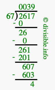 The image displays 39 at the top, which is the quotient, and 4 at the bottom, which is the remainder. Therefore, the answer to 2617 divided by 67 (2617 ÷ 67) using long division is 39 remainder 4, or simply 39 R 4.