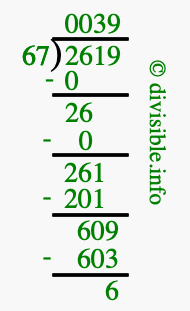 The image displays 39 at the top, which is the quotient, and 6 at the bottom, which is the remainder. Therefore, the answer to 2619 divided by 67 (2619 ÷ 67) using long division is 39 remainder 6, or simply 39 R 6.