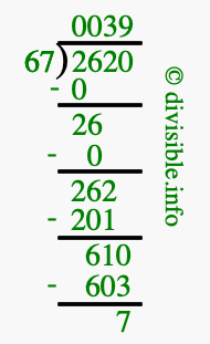 The image displays 39 at the top, which is the quotient, and 7 at the bottom, which is the remainder. Therefore, the answer to 2620 divided by 67 (2620 ÷ 67) using long division is 39 remainder 7, or simply 39 R 7.