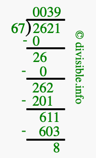 The illustration below shows you how to calculate 2621 divided by 67 using long division. As you can see, the dividend value of 2621 is located to the right of the "⟌" and the divisor value of 67 is located to the left of the "⟌".