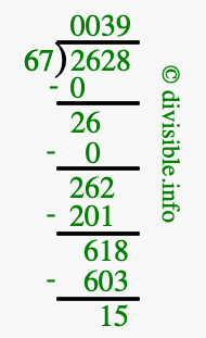 The image displays 39 at the top, which is the quotient, and 15 at the bottom, which is the remainder. Therefore, the answer to 2628 divided by 67 (2628 ÷ 67) using long division is 39 remainder 15, or simply 39 R 15.