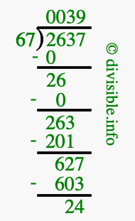 The image displays 39 at the top, which is the quotient, and 24 at the bottom, which is the remainder. Therefore, the answer to 2637 divided by 67 (2637 ÷ 67) using long division is 39 remainder 24, or simply 39 R 24.