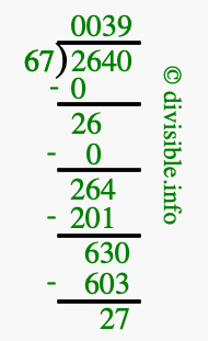 Here we will show you an image that illustrates how to calculate 2640 divided by 67 using long division. We will also give you the answer to 2640 divided by 67 (2640 ÷ 67) as a fraction and as a decimal.