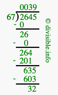 The image displays 39 at the top, which is the quotient, and 32 at the bottom, which is the remainder. Therefore, the answer to 2645 divided by 67 (2645 ÷ 67) using long division is 39 remainder 32, or simply 39 R 32.