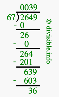 The image displays 39 at the top, which is the quotient, and 36 at the bottom, which is the remainder. Therefore, the answer to 2649 divided by 67 (2649 ÷ 67) using long division is 39 remainder 36, or simply 39 R 36.