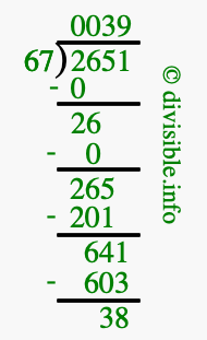 The image displays 39 at the top, which is the quotient, and 38 at the bottom, which is the remainder. Therefore, the answer to 2651 divided by 67 (2651 ÷ 67) using long division is 39 remainder 38, or simply 39 R 38.