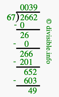 The image displays 39 at the top, which is the quotient, and 49 at the bottom, which is the remainder. Therefore, the answer to 2662 divided by 67 (2662 ÷ 67) using long division is 39 remainder 49, or simply 39 R 49.