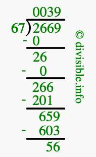 The image displays 39 at the top, which is the quotient, and 56 at the bottom, which is the remainder. Therefore, the answer to 2669 divided by 67 (2669 ÷ 67) using long division is 39 remainder 56, or simply 39 R 56.