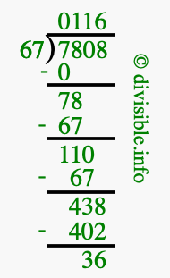 The image displays 116 at the top, which is the quotient, and 36 at the bottom, which is the remainder. Therefore, the answer to 7808 divided by 67 (7808 ÷ 67) using long division is 116 remainder 36, or simply 116 R 36.