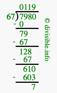 The image displays 119 at the top, which is the quotient, and 7 at the bottom, which is the remainder. Therefore, the answer to 7980 divided by 67 (7980 ÷ 67) using long division is 119 remainder 7, or simply 119 R 7.