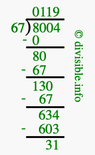 The image displays 119 at the top, which is the quotient, and 31 at the bottom, which is the remainder. Therefore, the answer to 8004 divided by 67 (8004 ÷ 67) using long division is 119 remainder 31, or simply 119 R 31.