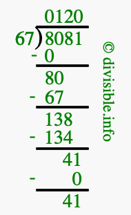 The image displays 120 at the top, which is the quotient, and 41 at the bottom, which is the remainder. Therefore, the answer to 8081 divided by 67 (8081 ÷ 67) using long division is 120 remainder 41, or simply 120 R 41.