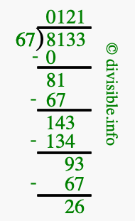 The image displays 121 at the top, which is the quotient, and 26 at the bottom, which is the remainder. Therefore, the answer to 8133 divided by 67 (8133 ÷ 67) using long division is 121 remainder 26, or simply 121 R 26.