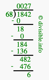 The image displays 27 at the top, which is the quotient, and 6 at the bottom, which is the remainder. Therefore, the answer to 1842 divided by 68 (1842 ÷ 68) using long division is 27 remainder 6, or simply 27 R 6.