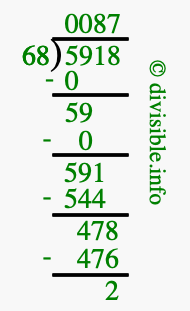 The image displays 87 at the top, which is the quotient, and 2 at the bottom, which is the remainder. Therefore, the answer to 5918 divided by 68 (5918 ÷ 68) using long division is 87 remainder 2, or simply 87 R 2.