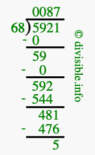 The image displays 87 at the top, which is the quotient, and 5 at the bottom, which is the remainder. Therefore, the answer to 5921 divided by 68 (5921 ÷ 68) using long division is 87 remainder 5, or simply 87 R 5.