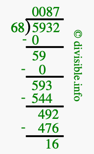 The image displays 87 at the top, which is the quotient, and 16 at the bottom, which is the remainder. Therefore, the answer to 5932 divided by 68 (5932 ÷ 68) using long division is 87 remainder 16, or simply 87 R 16.