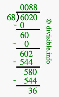 The illustration below shows you how to calculate 6020 divided by 68 using long division. As you can see, the dividend value of 6020 is located to the right of the "⟌" and the divisor value of 68 is located to the left of the "⟌".