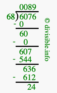 The image displays 89 at the top, which is the quotient, and 24 at the bottom, which is the remainder. Therefore, the answer to 6076 divided by 68 (6076 ÷ 68) using long division is 89 remainder 24, or simply 89 R 24.
