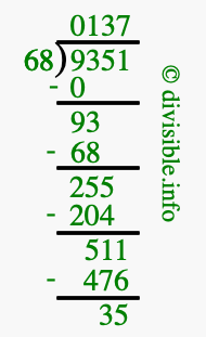 The image displays 137 at the top, which is the quotient, and 35 at the bottom, which is the remainder. Therefore, the answer to 9351 divided by 68 (9351 ÷ 68) using long division is 137 remainder 35, or simply 137 R 35.