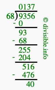 The image displays 137 at the top, which is the quotient, and 40 at the bottom, which is the remainder. Therefore, the answer to 9356 divided by 68 (9356 ÷ 68) using long division is 137 remainder 40, or simply 137 R 40.